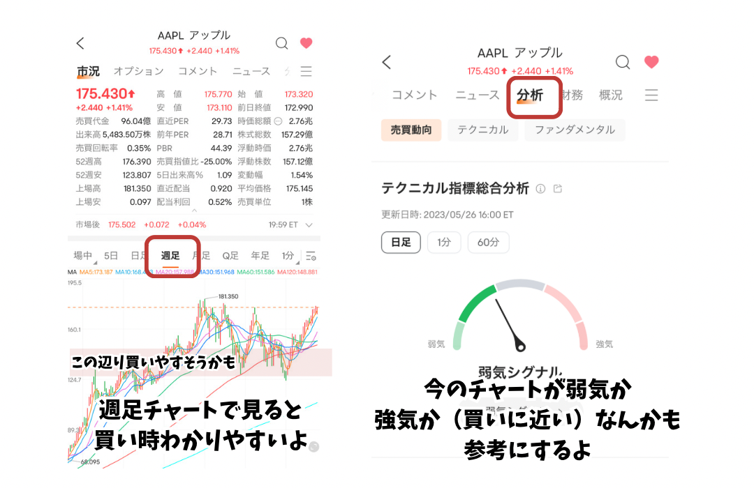 また、私がよく見るのはmoomoo証券のアプリで、分析やその銘柄に関するニュースがすぐに見れるので、買う前には一度確認をしていますよ。
