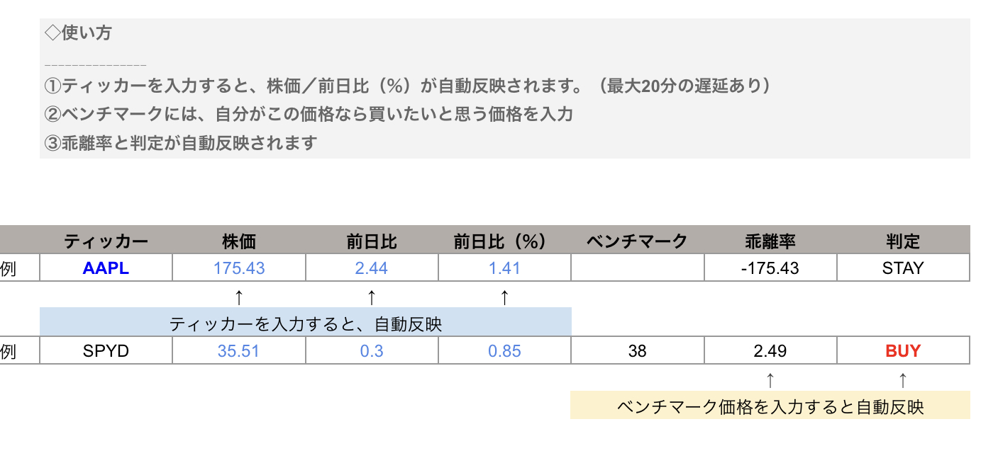シンプルな作りにしており、ティッカーとベンチマーク価格のみご自身で入力いただければ、現在の株価や判定は自動で表示されます!(もちろん無料で配布しますよ♡)
